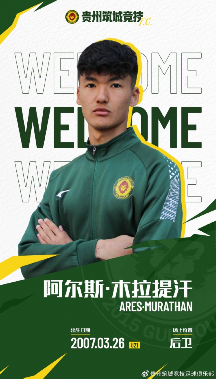 ​​经与球员协商一致,阿尔斯-木拉提汗正式加盟贵州筑城竞技足球俱乐部。阿尔斯-木拉提汗2007年3月26日出生于新疆乌鲁木齐,身高192cm,体重80kg,司职中后卫。